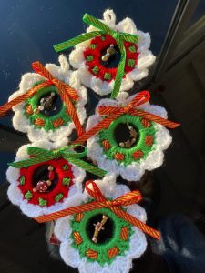 I don’t yet know the total amount raised, but every little helps! I’ve now swapped the Christmas decorations for other crochet gifts, which are currently on sale at the local craft shop.”